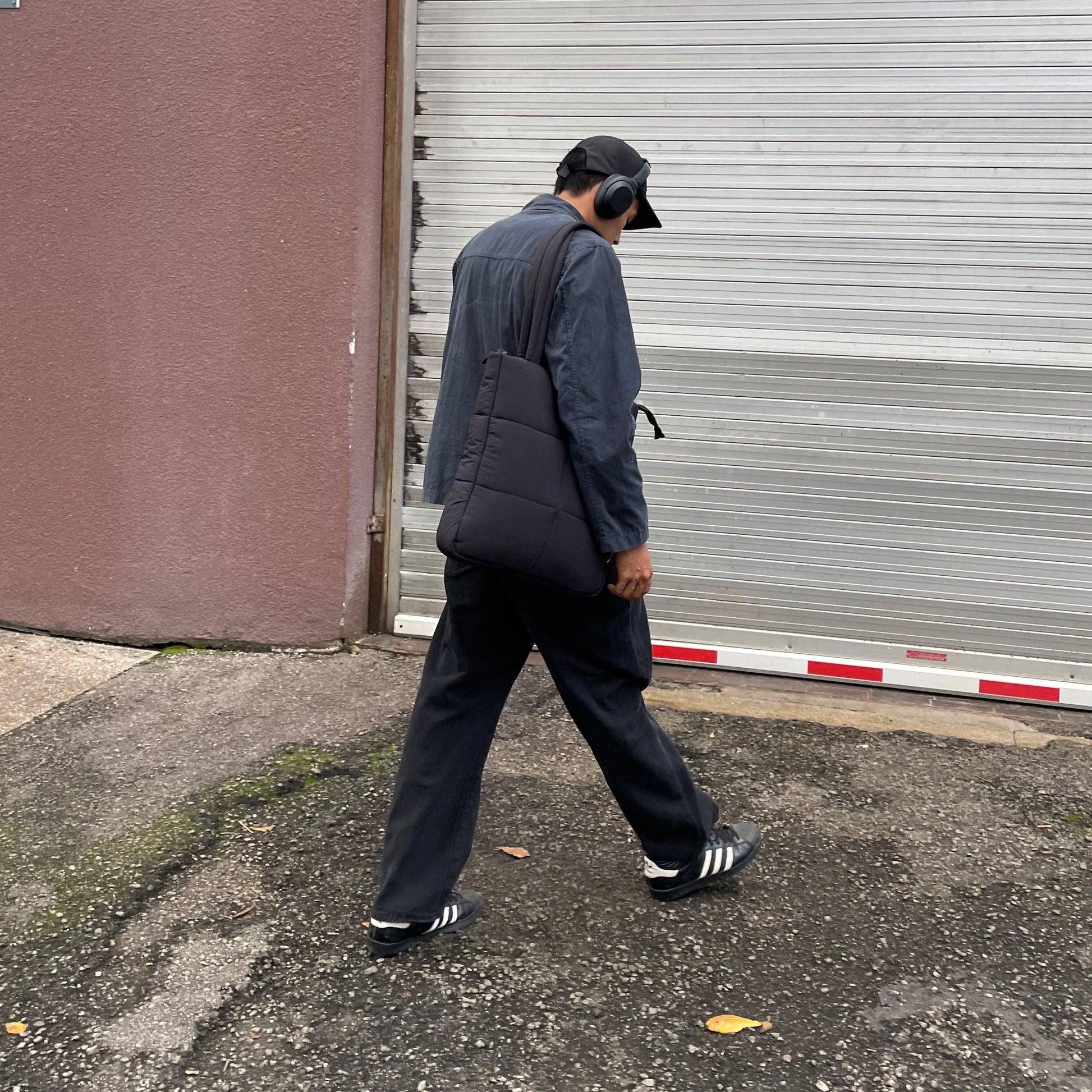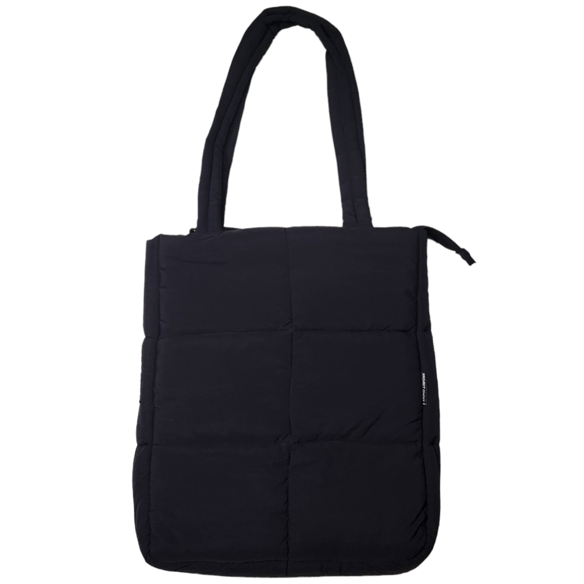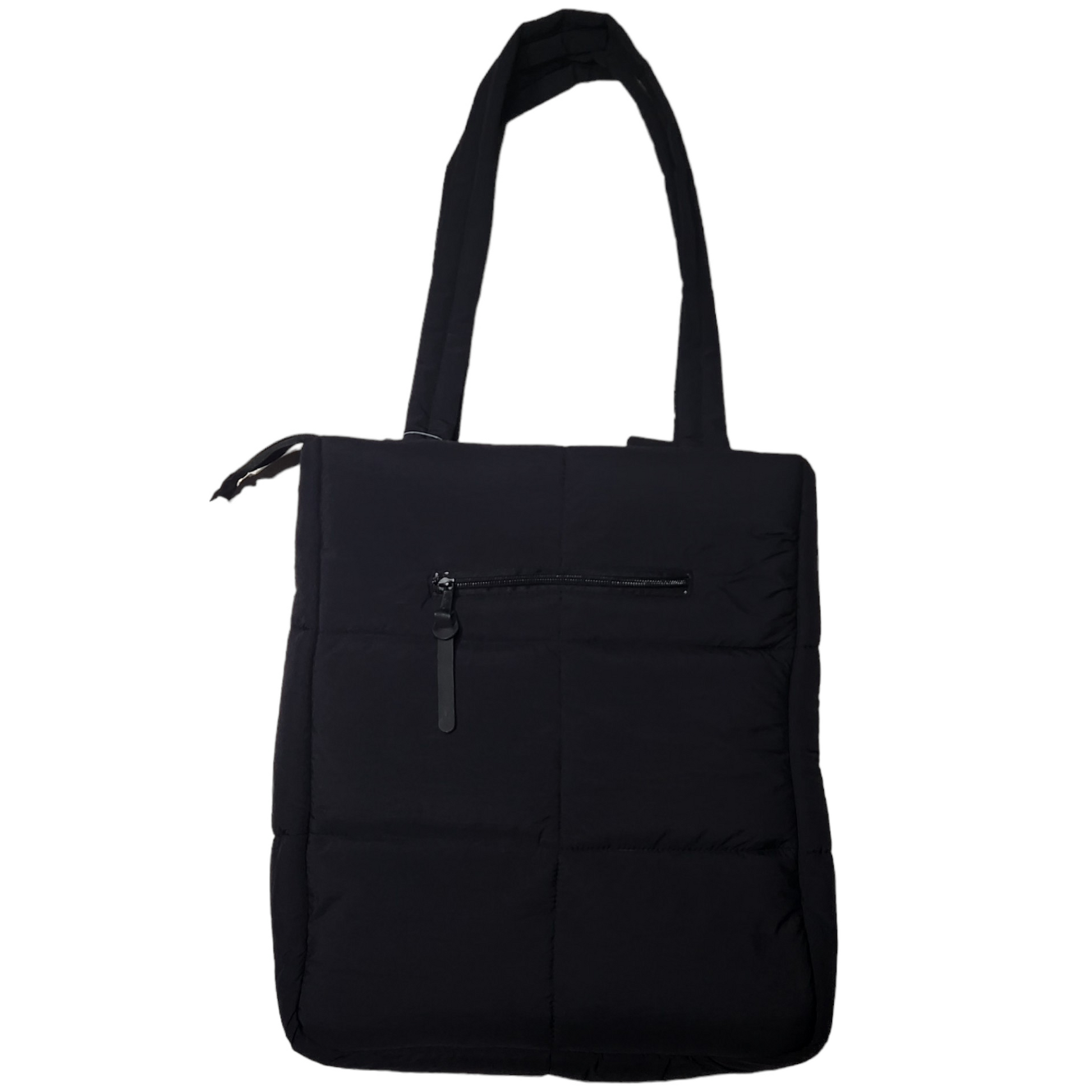 Introducing our Puffer Tote Bag: a stylish, water-resistant nylon bag with a back pocket for easy access to your phone and wallet. It features a zipper closure, a spacious compartment, a bottle compartment, two small compartments, a keyclip, and can fit a 14-inch laptop. Upgrade your everyday carry with this sleek and functional bag.